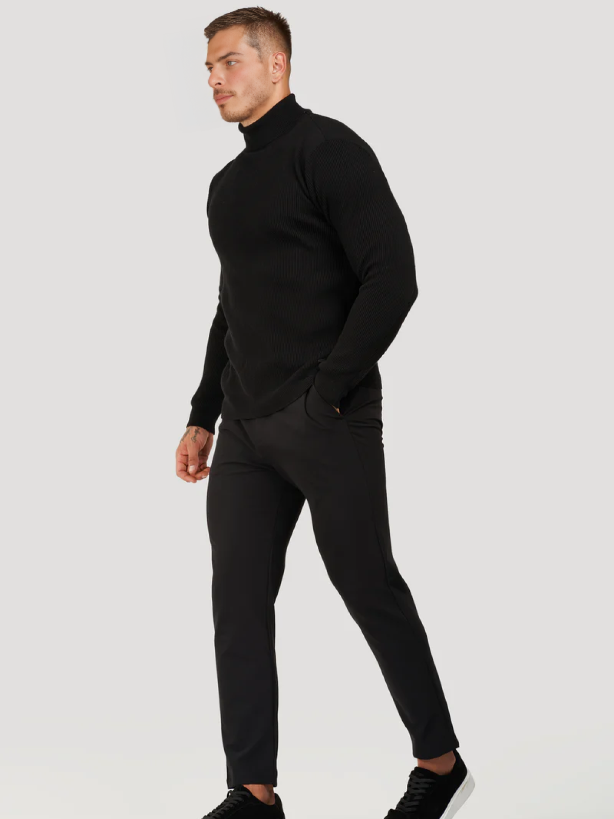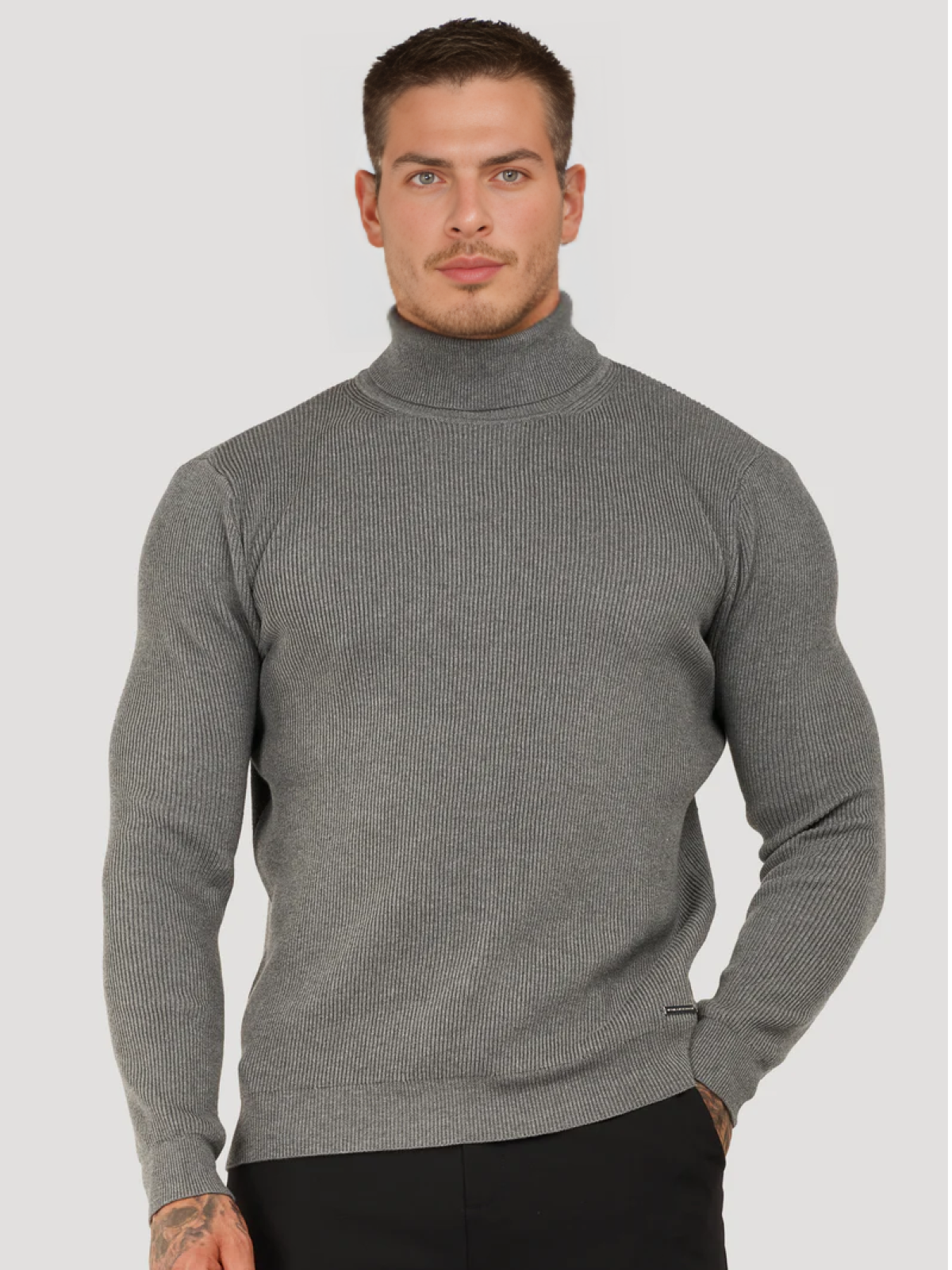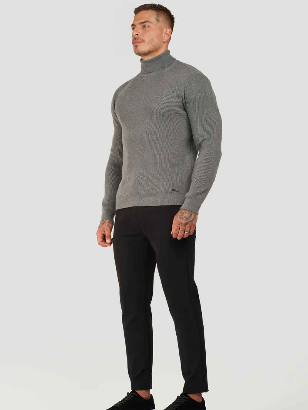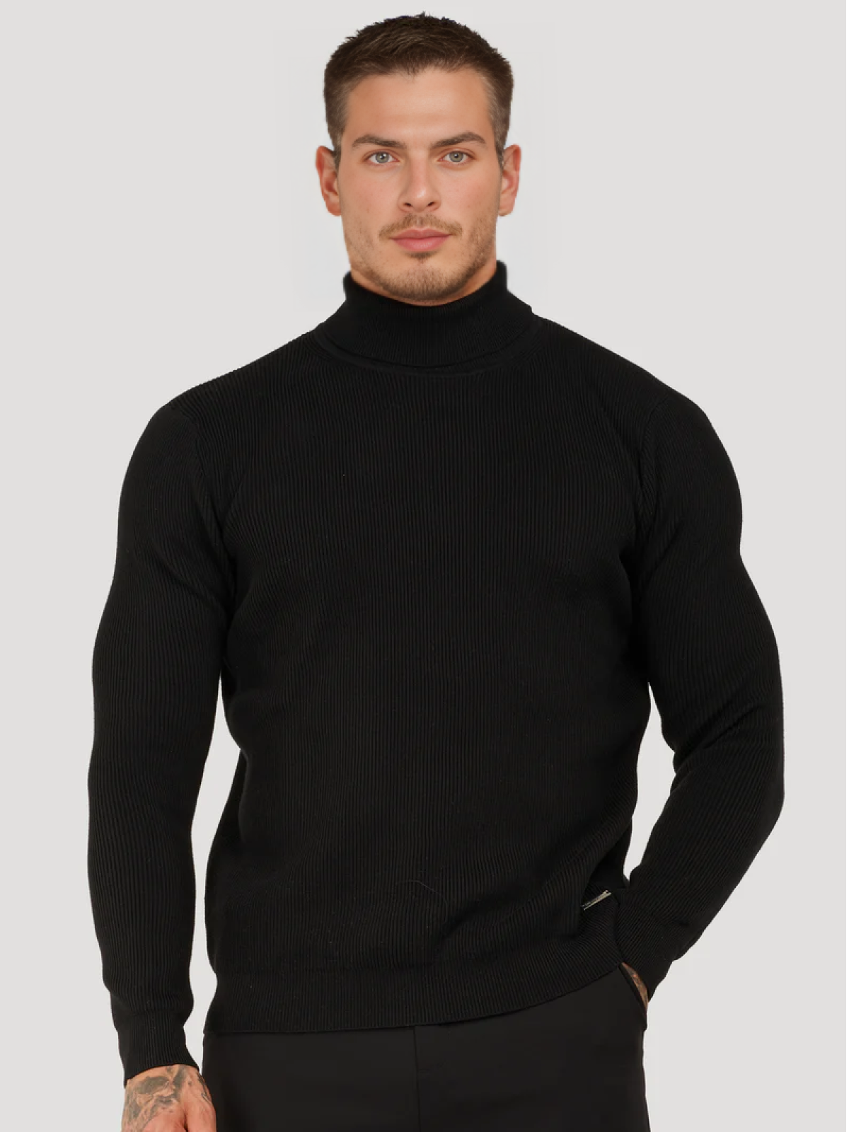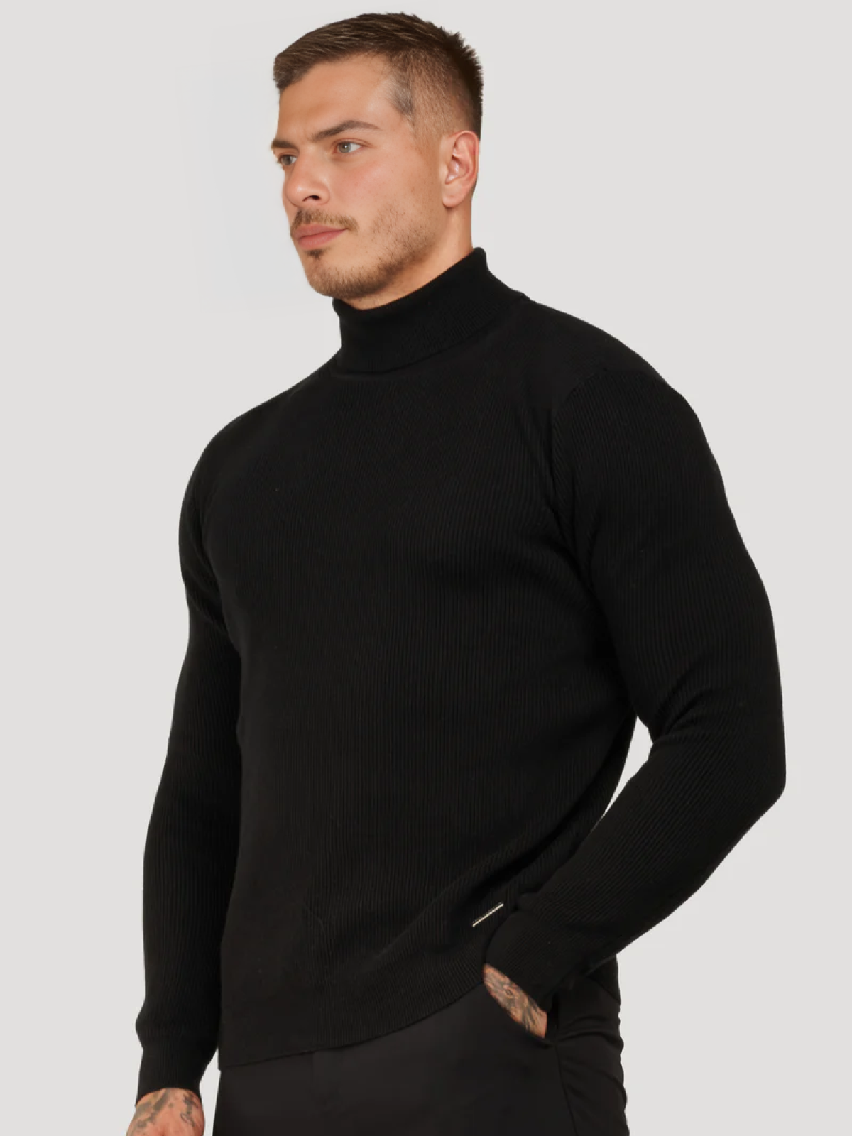 Add a touch of sophistication to your wardrobe with the Fiori Turtleneck Sweater. This slim-fit sweater has a ribbed structure that provides both warmth and style. The turtleneck provides comfort and is perfect for chilly days or layering under a jacket.