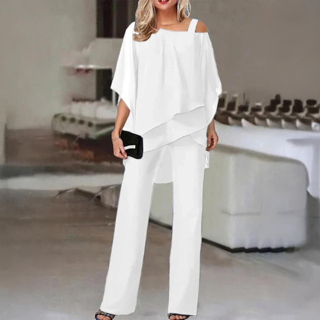Get ready to shine and feel absolutely fantastic with Amalia for women. This elegant two-piece ensemble combines comfort and effortless style, making it perfect for any occasion. With its chic off-shoulder design and sophisticated pants, you'll stand out at any party or event. Made from luxurious chiffon, it's available in a range of vibrant colours to suit your mood. Embrace your curves with confidence and show that style has no limits.